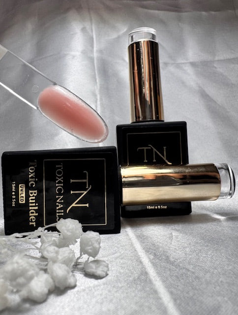 Aanbrengen van de BIAB: Breng een dunne laag aan en hard uit 60 sec LED / 120 sec UV. Breng een vollere laag aan en bouw een lichte bolling (apex) op.