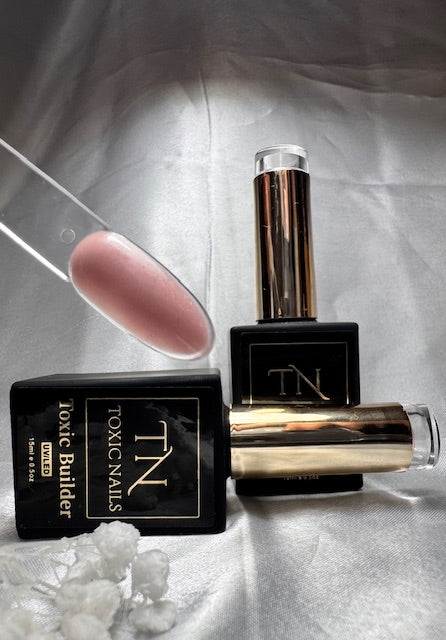 Aanbrengen van de BIAB: Breng een dunne laag aan en hard uit 60 sec LED / 120 sec UV. Breng een vollere laag aan en bouw een lichte bolling (apex) op.
