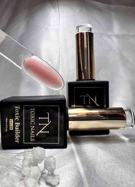 Aanbrengen van de BIAB: Breng een dunne laag aan en hard uit 60 sec LED / 120 sec UV. Breng een vollere laag aan en bouw een lichte bolling (apex) op.