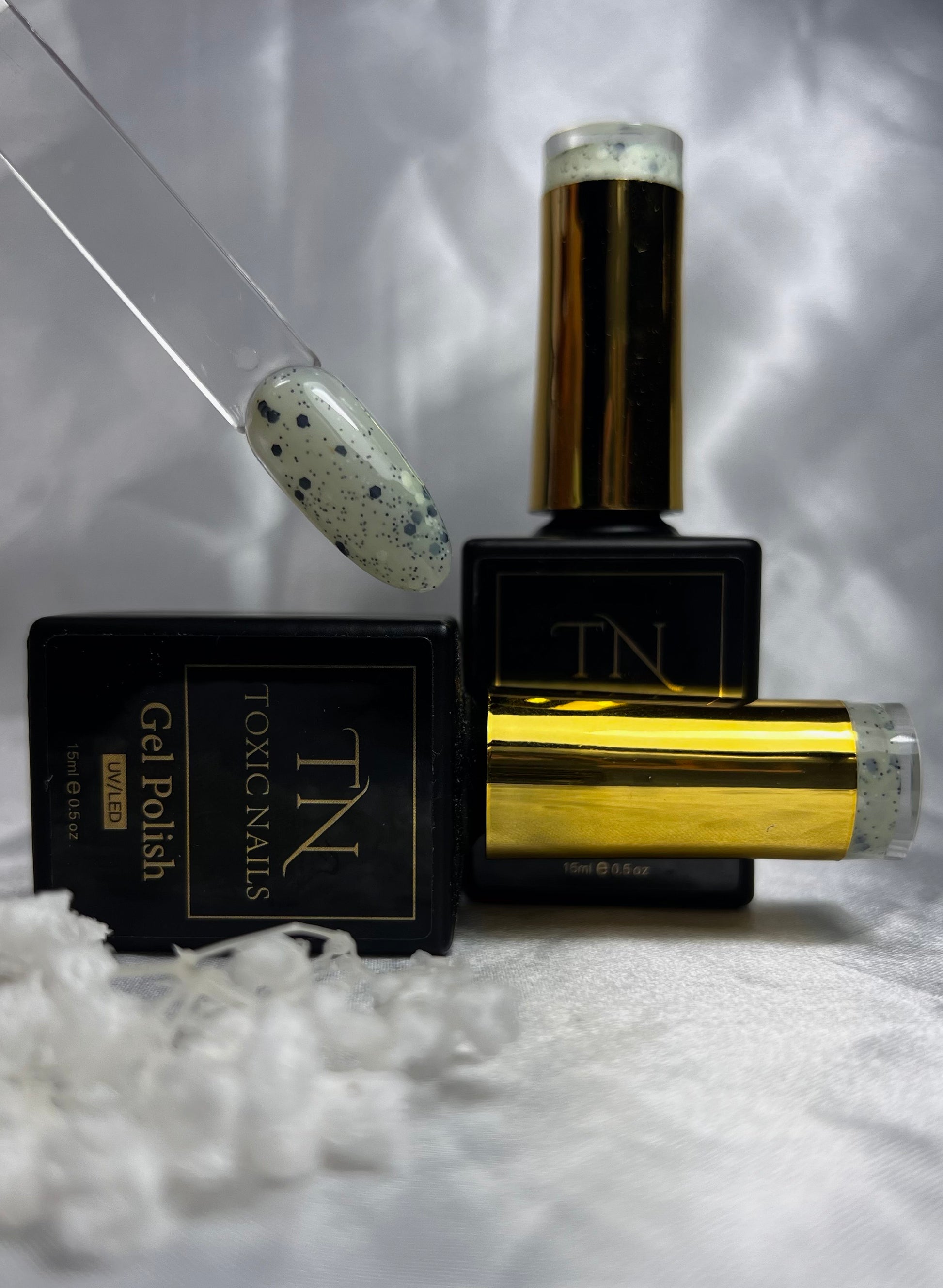 Apple swirl deze unieke nagellak combineert een levendige groene basis met speelse zwarte spikkels, perfect om een stijlvolle en opvallende look te creëren.